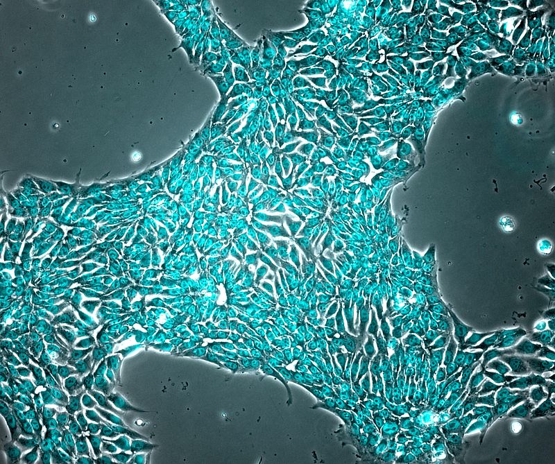 Human iPSCs glowing with a cyan fluorescent halo tag